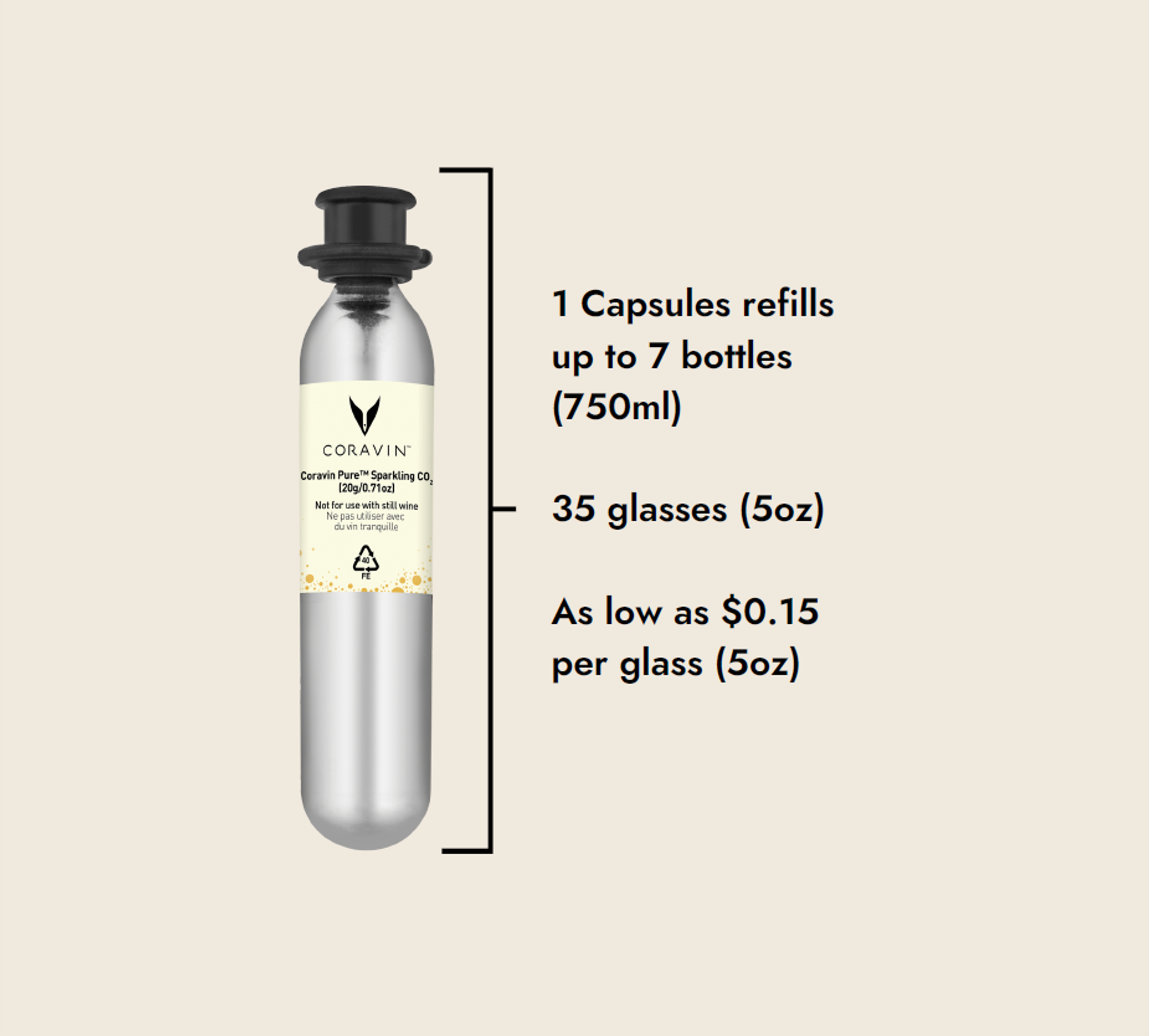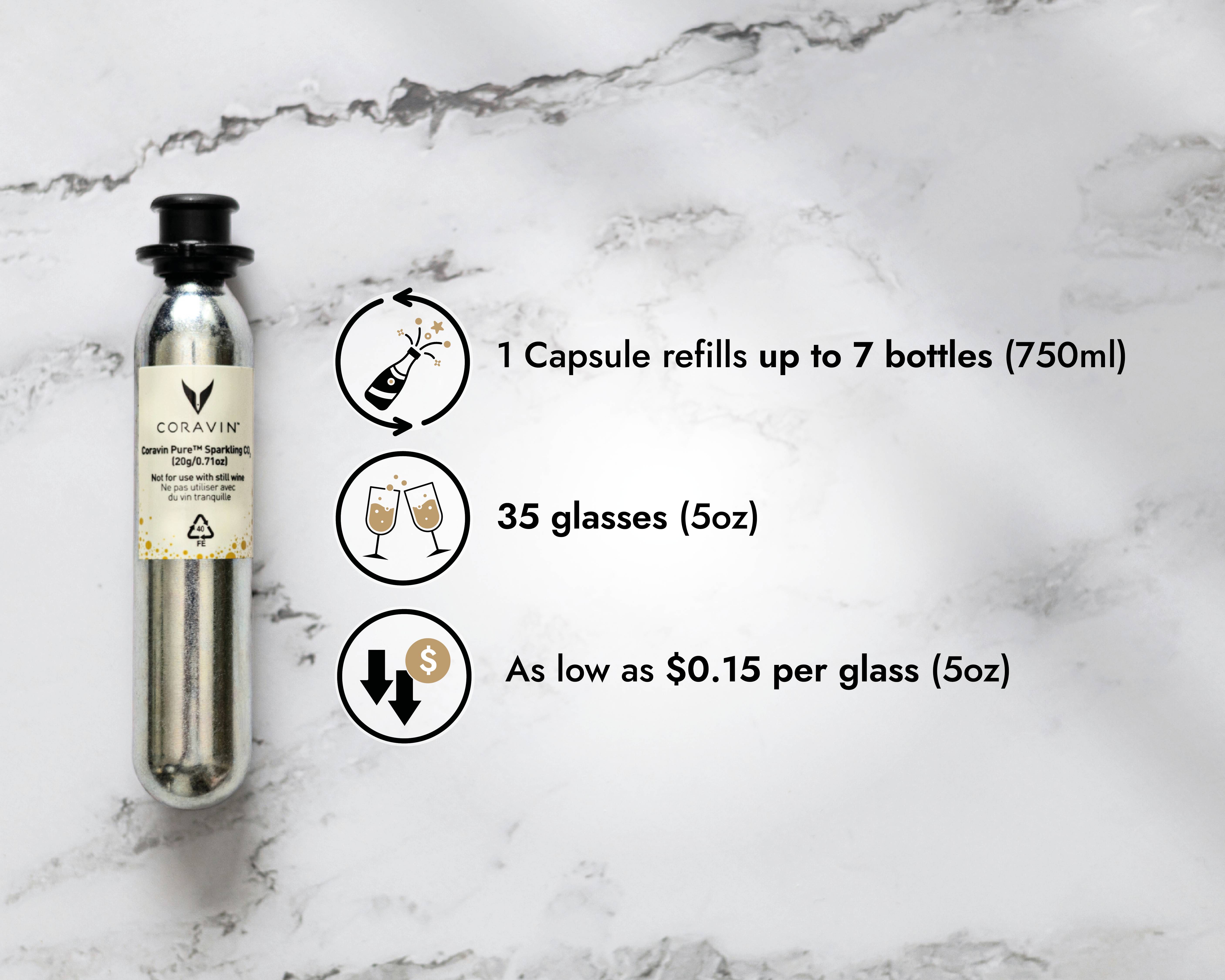 Coravin Pure CO2 Capsules powers Coravin Sparkling System. These replacement Capsules are filled with pure CO2, the same gas that creates bubbles in sparkling wine, to preserve its taste and effervescence for up to 4 weeks.